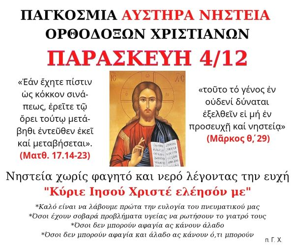 Αδελφοί μου, μια προσπάθεια που πρότεινα στα πνευματικά μου παιδιά στην Ελλάδα και το Εξωτερικό. Να νηστέψουμε την Παρασκευή 4/12 λίγο πιο αυστηρά, ζητώντας το έλεος του Θεού. Κατά το μέτρο των δυνατοτήτων του καθενός. Σε όσους είναι εφικτό, ας νηστέψουν την τηλεόραση και το διαδίκτυο.